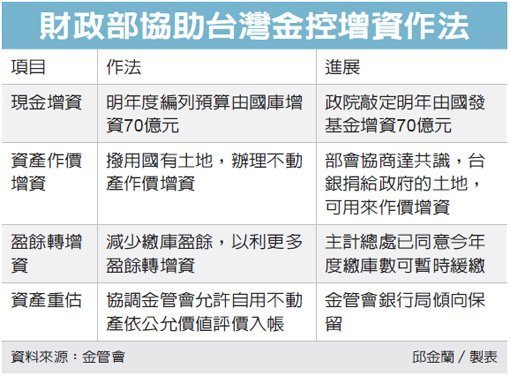 財政部官員昨(16)日表示,原本修正案是規劃由政府資產作價增資,金管會銀行局主張再限縮範圍,以免監理上對其他銀行不公平等問題,後來雙方達成共識,限過去台銀捐給政府的不動產,政府可以資產作價方式,替台灣金增資。 過去曾有保險公司以不動產作價方式辦理增資,銀行則因法規明訂不能投資非自用不動產,至今沒有銀行以不動產作價增資的案例,台灣金可能成為首例。 除了資產作價外,在財政部積極協助下,行政院也指示明年度由國發基金現金增資台灣金控70億元。 根據台銀方面估算,國有地作價增資200億元,再加上70億元現金增資,合計270億元,將可讓台銀的資本適足率拉高1個百分點。 財政部近日內將把台灣金控條例修正案呈報行政院,修正案重點除了資產作價增資外,還包括適度鬆綁採購限制,例如海外分支機構的採購,可免除採購法限制等。 至於人事、預算及決算的鬆綁,相關主管單位仍有不同意見,上周協商沒有共識,將由行政院作最後決定。