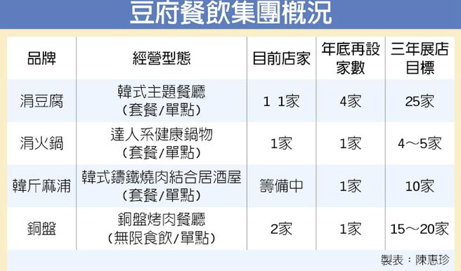 吳柏勳指出,「銅盤 .嚴選韓式烤肉」,兩個月前於新竹巨城購物中心正式開幕之後,即使開放兩周前電話預訂,其名額都在短短一個小時內秒殺,因此,該品牌進入百貨體系處女秀,就選在位於台南火車站旁的新光三越中山店。 目前擁有四大品牌的豆府集團,目前員工總人數約450名左右,員工可依其服務的單店稅後盈餘15%分紅,在人才較易招攬前提下,吳柏勳不諱言,該集團營運將進入快速展店期。 預定至今年底擴張版圖的地點,包括涓豆腐要在設立四家,包括台北新光三越西門店、桃園青浦華泰、新莊佳鴻百貨、嘉義秀泰等地;涓火鍋將再設新北板橋店;韓斤府浦店第一家據點預定於10月23日,坐落微風A3;銅盤除現有兩家餐廳之外,今年底之前,進軍南高雄。(工商時報)