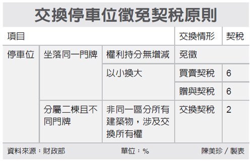 但是財政部說,如其交換方式是以小車位換大車位,交換行為會產生財產增加的情形,視同所有權已經移轉,交換人應該就增加的權利部分,繳納6%稅率的買賣契稅或贈與契稅。 財政部同時規定,互換停車位不需要申報繳納契稅的範圍,僅限雙方互換的停車位,位處同一門牌坐落的區分所有建物之內,如果分屬於兩棟不同門牌坐落的區分所有建物內,這類交換停車位的行為,就不是單純的停車位編號變更而已,車位互換行為已涉及交換所有權,應依法申報繳納2%稅率的交換契稅。