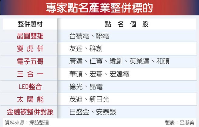 日月光收購矽品案,雙方持續火熱過招!投資專家認為,全球經濟景氣波動加劇,及大陸紅色供應鏈威脅日增的雙重壓力,勢將加速國內產業整合風潮。在全球產業走向「大者恆大、強者恆強」趨勢下,為了能迎戰未來股市熊市行情,及對抗紅色供應鏈威脅,台灣應積極展開整併。 整併正在打破過去思維 第一金投顧董事長陳奕光指出,連封測雙雄中的日月光,都出其不意突然宣布收購矽品,可見產業間的整併隨時可能發生,整併的方式也打破過去的思維與遊戲規則。 陳奕光點名晶圓雙雄併 陳奕光直接點名,未來「晶圓雙雄併」、「面板雙虎併」、「電子五哥併」、「華碩、宏碁、宏達電三合一」、「兩大LED廠整併」、「茂迪及新日光兩大太陽能廠扮演發動者進行11家公司合併」及「金融業併購」等,都值得思考整併,甚至不排除會出現。 台股經過這波重挫,不少公司個股跌破淨值,不但小股東哀鴻遍野,大股東也紛紛買股自救,公司祭出庫藏股也在8月達到約160家新高,顯示很多公司股價已跌過頭,偏離基本面。 日月光率先發動攻擊,8月下旬宣布將以每股43元收購5~25%持股,8月底矽品、鴻海宣布擬進行策略聯盟,展開反收購行動,引發市場不同看法。