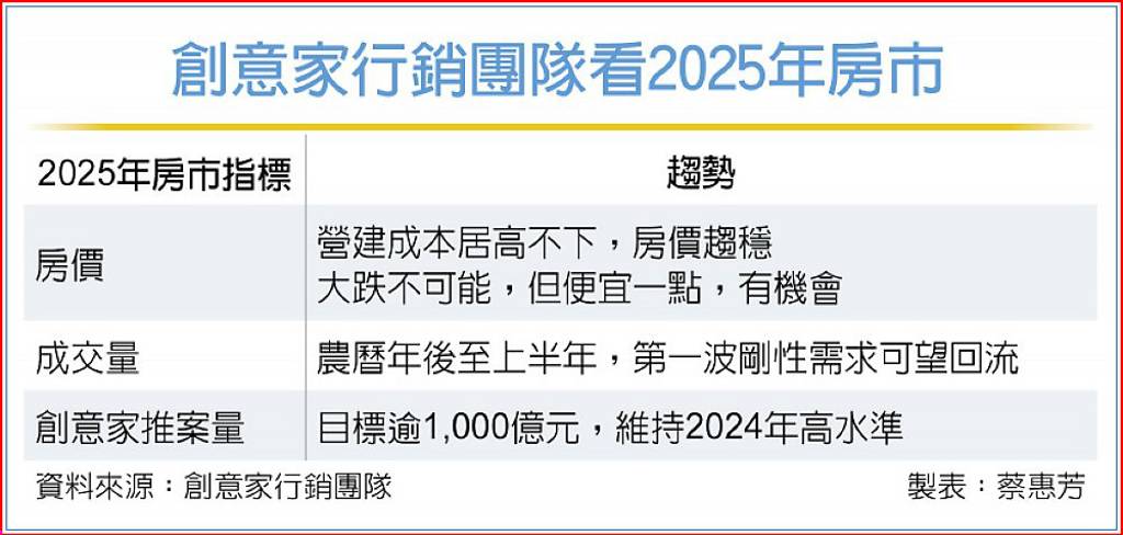 展望2025年,柯仲武分析,相信打房政策實施半年後,應有一定政策效果,但營建成本仍居高不下,預期房價要大幅下跌,並不大可能,但便宜一點的機會,倒是有可能。創意家預期2025年農曆年後至上半年,房市可望逐漸回溫,關鍵在於購屋客戶能不能回到市場上,第一批回流客戶,一定是剛性需求,所以上半年不致全面大好,但至少買氣、成交量會逐步回溫,預期2025年房市應呈「價穩、量也穩」格局。
