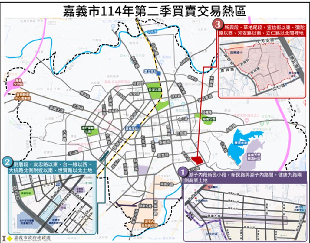 嘉義市不動產價格長期居高不下,台積電來嘉義設封測廠,更帶動不動產交易熱絡,嘉義市政府公布今年4月至6月嘉義市不動產買賣交易熱區,第一名是仍是區段徵收開發後的湖子內區,主要是新建案的預售屋完工交屋。嘉市府地政處公布今年第2季不動產買賣交易熱區,湖子內仍穩坐第1名,包括湖子內段新民小段,新民路與湖子內路間、健康九路兩側商業土地都成交熱絡,平均交易單價每坪約25.56萬元。