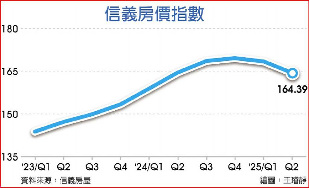 房市經過三季以來的量縮,房價鬆動跡象日益明顯,最新公布的第二季信義房價指數為164.39,季減2.39%、年減0.09%,其中新竹、台中及高雄房價均出現連二季下行走勢,新北及桃園均自今年第一季的歷史高點反轉下修,整體房價與去年同期相當,顯示房價已脫離連續創高走勢,開始進入盤整期。