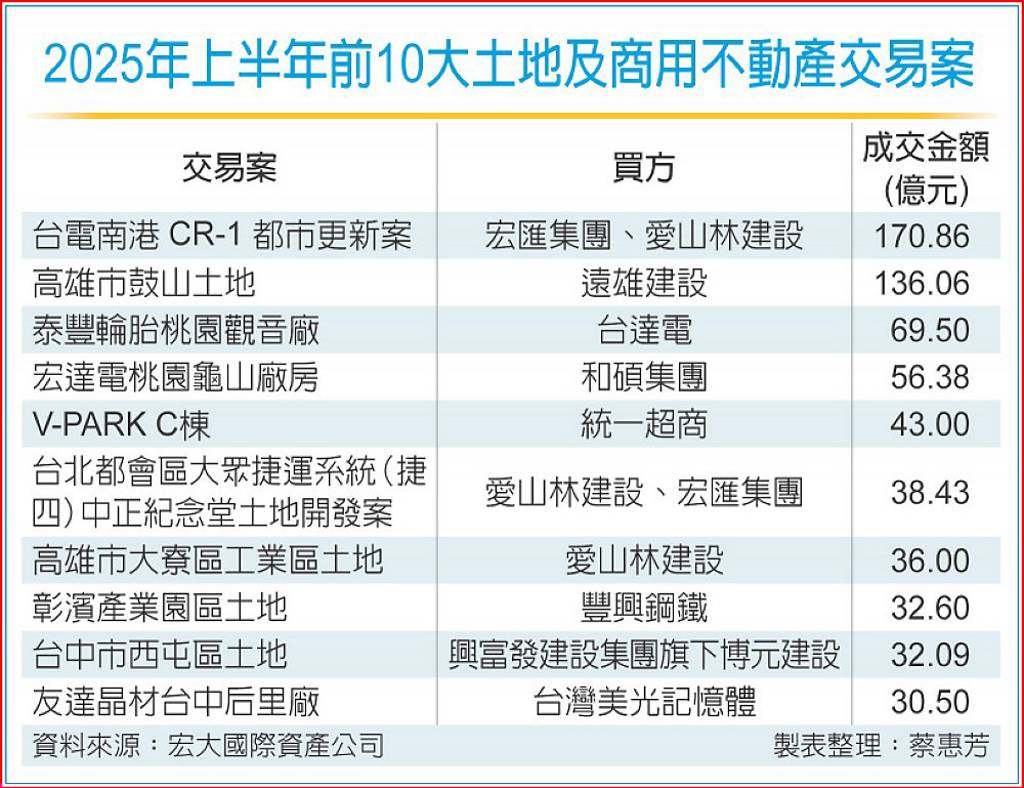 宏大國際資產公司總經理陳益盛表示,今年上半年交易金額最大的不動產交易案,總價動輒都百億元以上,分別是宏匯、愛山林以170.86億元取得台電CR-1都更案,及遠雄建設砸下136.06億元購買高雄市鼓山區土地,顯示建商看好區域長期發展;至於台達電斥資69.5億元購買桃園觀音廠房,則是今年是商用不動產規模最大的交易案。