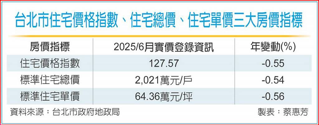 北市地政局22日公布6月「實價登錄價量動態」指出,6月住宅價格指數127.57、月跌0.38%,創下近14個月最低紀錄,回到去年4月水準,年跌幅約0.55%;標準住宅總價方面,平均每戶約2,021萬元、跌至近14個月最低量;至於標準住宅單價,每坪64.36萬元、跌至近12月新低,三大價格指標都同步衰退。