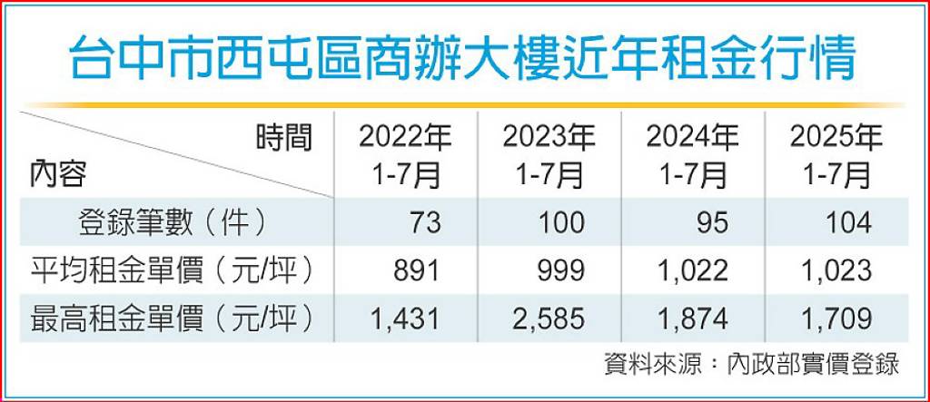 據實登資料顯示,台中西屯區近四年商辦大樓租賃件數逐年增加,累計超過560家新租客進駐,租金單價平均漲幅約15%;七期新市政中心,租金穩居每坪千元以上,如「聯聚中雍大廈」、「CBD時代廣場」、「NTC國家商貿中心」等,最高租賃行情落在每坪2,300至2,900元之間。