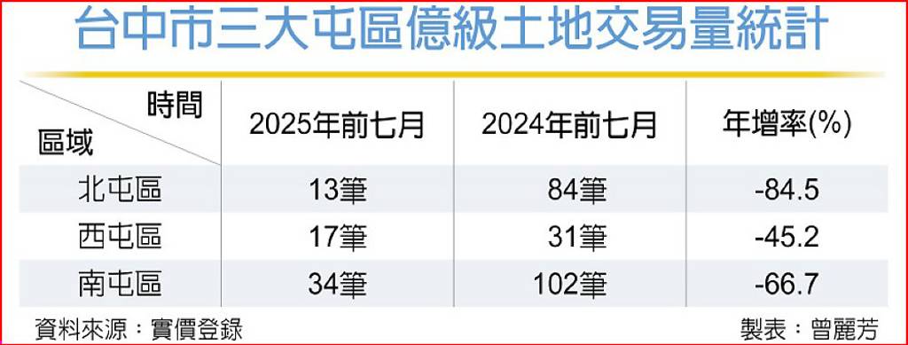 觀察前七月台中三大屯區土地交易,北屯區僅13筆交易,相較於去年同期的84筆,暴跌84.5%,是三屯區中縮水最明顯的區域;南屯區34筆,比去年同期的102筆大減66%;西屯區則從31筆掉到17筆,跌逾45%。