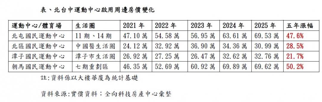 根據全向科技房產中心統計實價登錄數據,在北台中4大運動中心中,西屯朝馬國民運動中心5年漲幅達50.2%,單價站穩6字頭;而北屯國民運動中心所在的11期、14期重劃區,則上漲47.6%,單價逼近7字頭;至於北區與潭子運動中心周邊,近5年亦有2~3成漲勢。