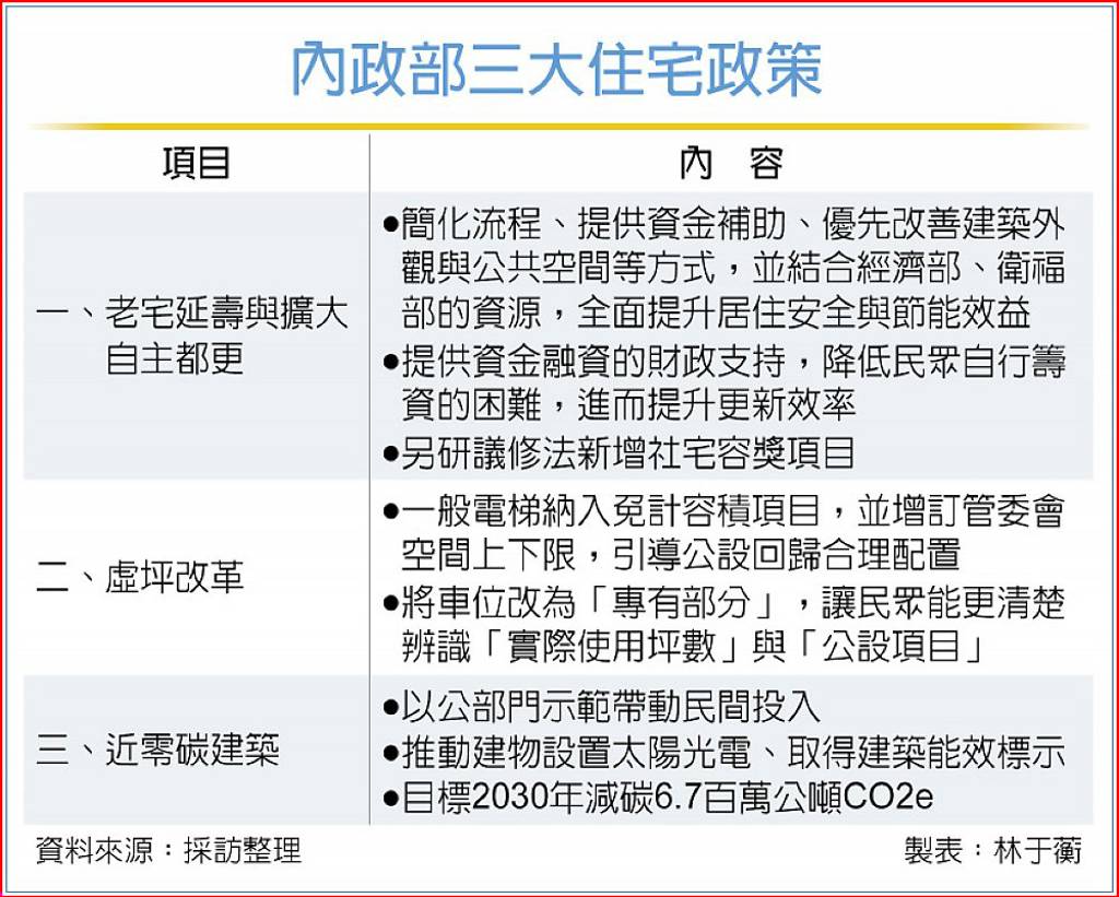 另一方面,內政部檢討住宅公共設施配置比例與購屋合理負擔等問題,推動「虛坪改革」,將一般電梯增列為免計容積項目,另增訂管委會設置面積的合理標準及上下限,導入「適質適量」設計思維,引導住宅產品之公設回歸合理配置。