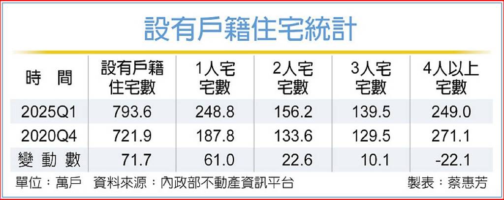 再看全台住宅戶籍變化,「一人宅」也反映出家庭結構變化,包括單身族增加、三代同堂減少;戶內人口減少下,使得「一人宅」逐年增加,以今年第一季來說,全台設有戶籍住宅約793.6萬宅,較2020年第四季增加71.7萬宅,其中以1人一宅者增加61萬戶最多,5年內大增32%;2人一宅、3人一宅分別增加22.6萬宅與10.1萬宅;反觀4人以上一宅者,則減少22.1萬宅。