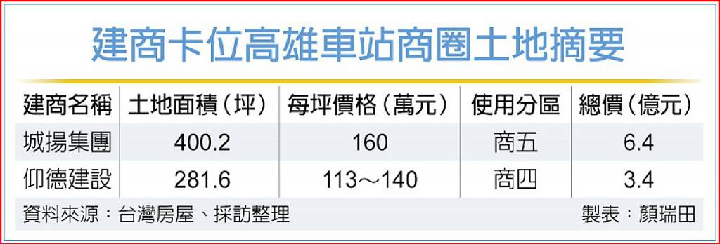 高鐵正式南延至高雄車站,使得高車成為左營站之後,擁有臺鐵、捷運和高鐵「三鐵共構」的交通轉運核心,而高雄市政府也正推動高雄車站「大都更計畫」,看準未來商圈發展紅利,城揚建設集團、以及仰德建設等在地大咖建商,搶進購地卡位,也使得高雄車站商圈的土地價格,漲至每坪160萬元高價。