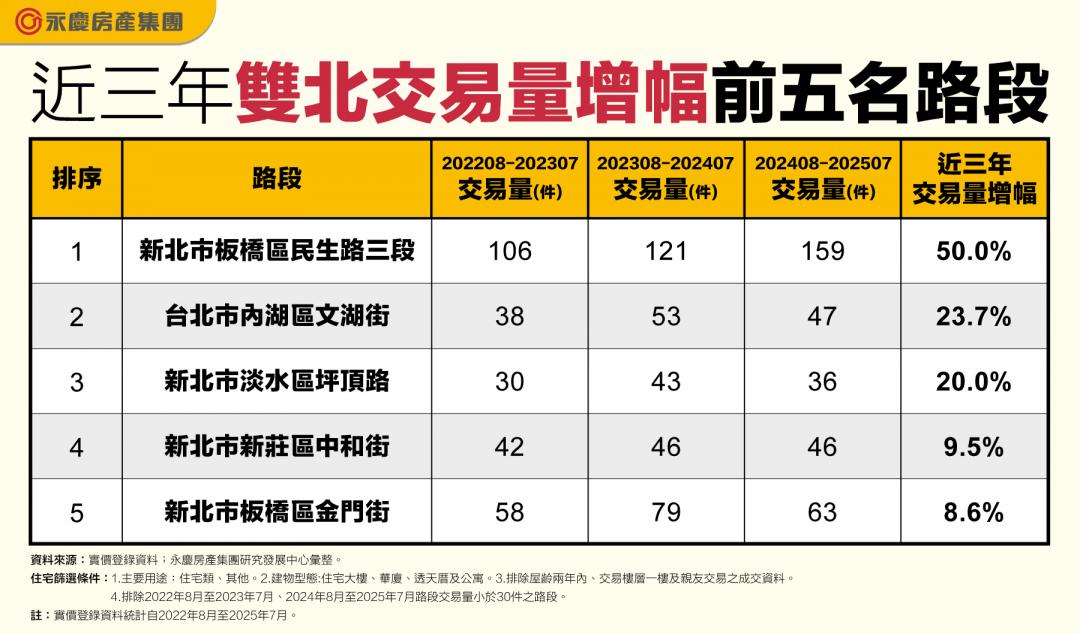 根據統計,新北市板橋區民生路三段近3年交易量由2022年8月的106件,連年增長至2025年7月的159件,增幅達50%,成為雙北交易量成長幅度最高的路段,而該路段近1年平均單價約為每坪73萬元,屬於新北市中高價帶,但買氣依舊旺盛。