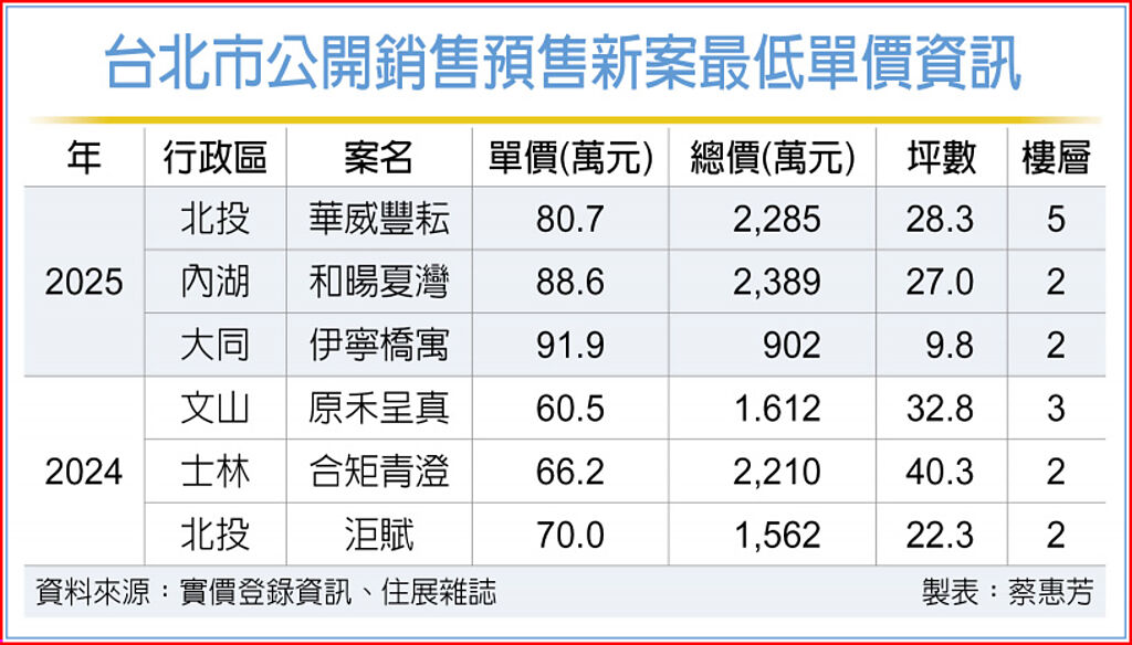《住展雜誌》彙整北市2024、2025年公開的預售住宅新案,去年實登揭露的每坪最低價為文山區「原禾呈真」、士林社子「合矩青澄」,與北投區復興崗一帶的「洰賦」,單價分別60.5萬、66.2萬、70萬元。