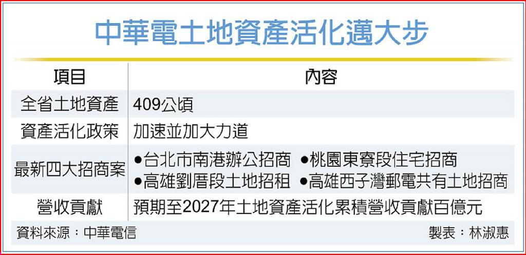 中華電信近年重要土地開發案,包括已投資約25億元開發南港舊機房為商辦大樓案,主要興建為含複合商場在內的A級商辦大樓與新機房各一棟,預定今年啟動招租作業,每年估可創造約1.5億元租金收入。子公司光世代建設與遠雄建設合建分售的青埔住宅案,預定2026年為中華電信帶來營收貢獻。