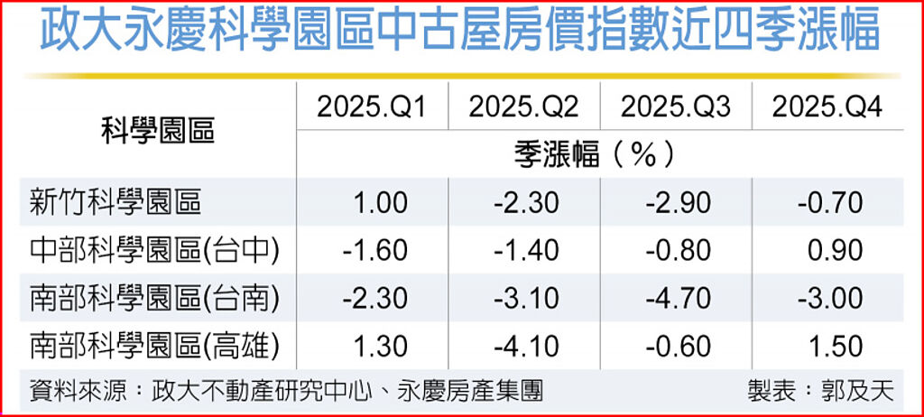 過去幾年帶頭急漲的科學園區房價,經過前幾季修正後,出現由跌轉為盤整的態勢。根據最新2025年第四季「政大永慶科學園區中古屋房價指數」顯示,台中科學園區房價季漲0.9%、高雄園區季漲1.5%,新竹園區跌幅縮小至0.7%,台南園區季跌3%、連續四季下修。