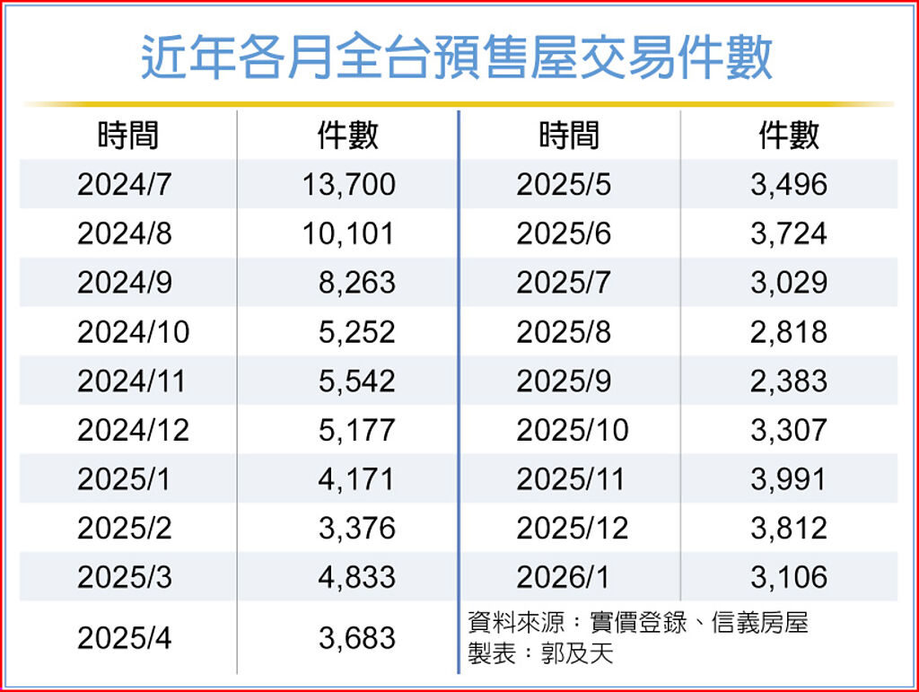 統計顯示,自2024年9月全台單月預售屋交易量跌破1萬件大關後,預售市場交易急凍,去年1月跌破5,000件,4月跌破4,000件,8、9月間甚至低至不到3,000件;不過去年10月起,已連續四個月站回3,000件之上。