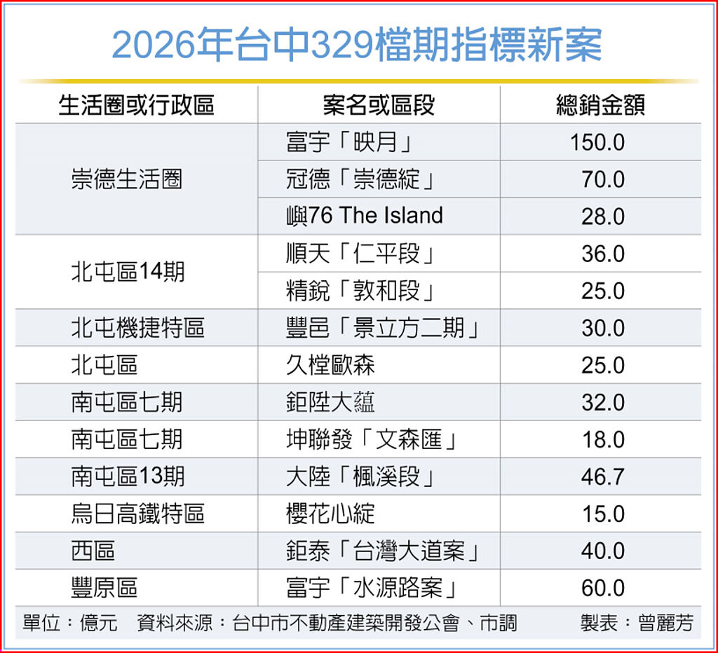 此外,成熟市中心同樣有新案登場。西區鉅泰建設將推出「台灣大道案」,總銷約40億元;富宇建設推出「水源路案」,總銷約60億元,鎖定在地自住族群。