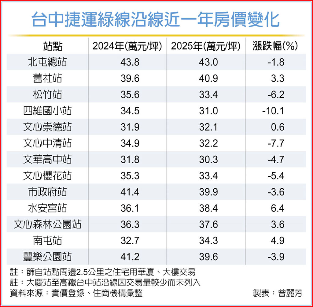 台中捷運綠線4月即將通車滿五年,房仲業者統計實登資料發現,沿線各站周邊房價出現明顯分化,即使位處市區核心的蛋黃地段,也呈現「跌多於漲」的情況,僅有少數站點維持逆勢抗跌。
