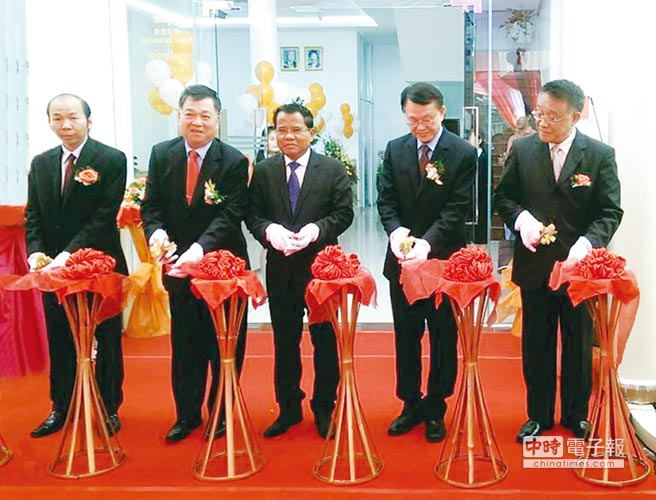 臺灣企銀董事長朱潤逢(左二)、柬埔寨央行銀監局長 Mr. Kim Vada(中)、臺灣企銀微型財務公司董事長陳長義(右二)、澳法建設公司李坤泰勛爵(左一)、曼哈頓國際公司楊克誠董事長(右一)共同出席柬埔寨「臺灣企銀微型財務公司」開幕典禮。圖/蔡淑芬
