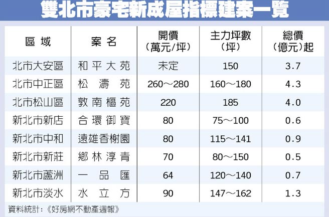此外,元利建設投資興建的新豪宅「和平大苑」近期將全面完工,原先預計要接案銷售的代銷公司與建商接案價仍有段差距,迄今未正式接案銷售,然以區段行情來推估,每戶總價3億元起跳。另位於松山區的「敦南樞苑」,為單層單戶185坪的產品,也是要價4億起跳的超高總價豪宅。 新北市方面,16個新豪宅建案主要分布在重劃區內,包括中和、三峽、新莊、林口及五股、淡水,其中又以新莊及林口為大宗。 倪子仁表示,今年北市總價8,000萬元以上,特別是去年7月後取得使照的新豪宅,若非自用將被視為囤房,稅率大幅提高至3.6%,加上新屋標準單價等稅基大幅調高,使得這些動輒上億的新豪宅乏人問津,更成為建商的燙手山芋。 倪子仁認為,銷售中的新豪宅並不是都沒有看頭,只要產品力與品牌指名度夠強,還是有買家青睞,但位於蛋白區甚至蛋殼區的「假豪宅」,房價將出現較大幅度修正。(工商時報)