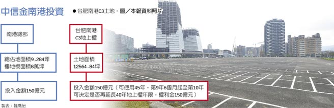 中信人壽及台灣人壽聯手第一標,12日以150億314萬元拿下台肥C3地上權45年的開發使用權,加計中信金控總部的9,284坪土地,未來中信集團握有南港土地面積近2.2萬坪,開發的辦公大樓面積更逾10萬坪以上,將具有該地區的租金「話事權」。 昨日標案是由中信人壽出資60%、台灣人壽出資40%的方式出價,僅高於底標價314萬元,被認為標的極漂亮,未來C3有1.2萬坪的土地上,將興建商場、旅館及辦公大樓,估計每年投報率逾3%以上。 加上150.03億權利金,未來中信人壽及台壽總投資金額上看300億元,也會為當地再帶來新的工作機會。