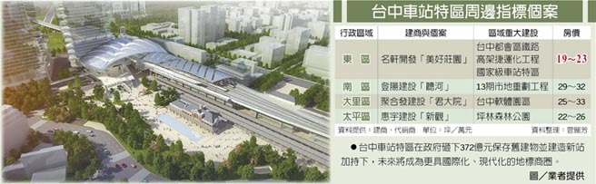 台中車站特區在政府砸下372億元保存舊建物並建造新站,朝更國際化、現代化地標商圈發展下,搭配鐵路高架化年底通車、大型都市計畫陸續完成等利多加持下,台中房仲業者認為,位於車站特區周邊的東區,目前房價還在「1」字頭,與南區,甚至是大里市區、太平市區出現2至3成的價差,因此,東區房價可望掀起落後補漲行情。