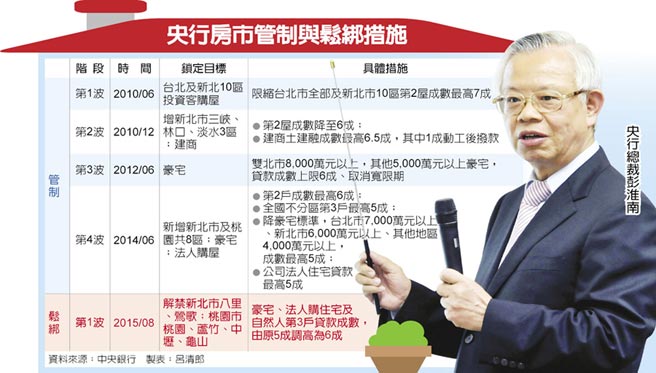 央行房市管制與鬆綁措施 實行近5年的房市選擇性信用管制邁出鬆綁第一步!中央銀行昨(13) 日無預警宣布,高價住宅、公司法人購置住宅,以及自然人第3戶購屋的 最高貸款成數,由現行5成調升為6成;並自房市管制區中刪除新北市八里、鶯歌兩區,及桃園市桃園、蘆竹、中壢、龜山等4區。