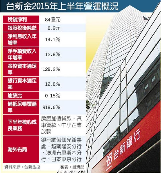 台新金今年上半年稅後純益84億元,每股稅後純益0.9元,較去年同期下滑,但淨利息收入及淨手續費收入均成長逾1成,台新金控總經理饒世湛說明,主要是投資收入大減超過25%,加上金融營業稅增加,導致上半年獲利較去年同期下滑。 但他強調,展望下半年房屋加值貸款、汽車貸款及中小企業放款仍將持續成長,淨利差及手續費收入預期也仍可穩定成長。 林維俊昨天也向法人重申,台新金失去彰銀經營權,造成股價至去年12月以來下跌27%,遠高於同期間金融股約11%的跌幅;基本上以台新金股東權益報酬率(ROE)15%,國際間合理的股價淨值比是1.5倍,但目前台新金股價淨值比僅約0.9倍,算是很委屈。(工商時報)