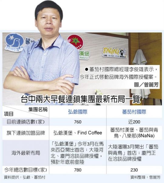 台中兩大早餐連鎖集團最新布局一覽 台中發跡、創業皆逾20年的早餐連鎖加盟品牌弘爺國際、蕃茄村國際,今年不約而同爭搶海外餐飲市場!其中,弘爺國際旗下的「弘爺漢堡」品牌,今年3月已在馬來西亞開出首家分店,年底前也將登陸展店;而蕃茄村國際旗下的「蕃茄與青鳥」品牌,今年也以海外授權模式、順利打進大陸市場。 創立28年的弘爺國際,旗下的「弘爺漢堡」品牌,目前全台連鎖加盟店達760家。弘爺國際執行長林洋豪表示,今年正式啟動國際授權案,弘爺將採取賣配方的授權模式,輔導加盟商食材在地化;今年3月,海外首家分店開在馬來西亞,目前已出現獲利,將對外開放加盟體系,預計第1年開出3家店、3年內開設10家分店。 林洋豪進一步表示,在站穩台灣市場後,弘爺國際目前正與大陸河北、廈門代理商洽談品牌授權案,「弘爺漢堡」最快將於年底前開出首家大陸分店。 此外,創立20年、目前擁有近200家「蕃茄村漢堡」早餐連鎖店的蕃茄村國際連鎖餐飲集團,今年也正式啟動海外國際授權案。