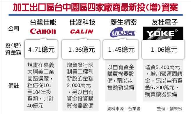 加工出口區台中園區四家廠商最新投(增)資案