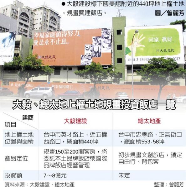 因應房市不景氣,台中部份建商放慢推案腳步,轉而拓展商業不動產,除了興建商辦大樓出租、收取固定租金收益外,包括大毅建設、總太地產等建商,在陸續標下國產署地上權土地後,均不約而同朝飯店規畫,爭相跨足飯店市場。 其中,大毅建設2013年底標下位於英才路、國立台灣美術館附近的440坪地上權土地,由於面對草悟道綠園道、鄰近勤美誠品商場、全國飯店商圈,每年吸引數百萬遊客到訪,大毅建設已規畫投資興建飯店,將委由本土飯店或國際品牌飯店經營管理,最快9月底前敲定,年底前動工興建。