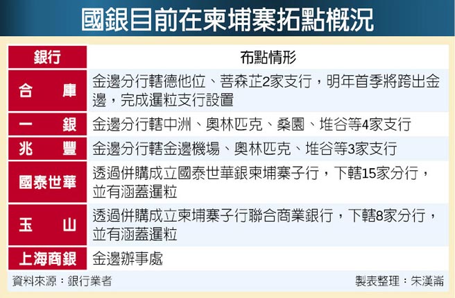 合庫已在上周收到柬埔寨央行所發出的核准函,准許合庫繼設立金邊分行及兩家金邊支行後,赴緊臨吳哥窟的城市暹粒開設支行,這可說是台資銀行在柬埔寨的分支行擴點首度跨出「大金邊」範圍,且為台資銀行首度跨足柬埔寨觀光聖地吳哥窟開立分支行,具有相當的指標意義。 近幾年柬國高達7%的經濟成長動能,以及人口紅利,吸引外銀蜂湧而至,柬國央行統計,去年第4季當地市場已有36家商銀及11家專業銀行,其中外商銀行與外銀分行合計有23家,熱門程度由此可見;也因金邊金融圈快速飽和,據了解,柬國央行已表態,希望外商銀行能走出金邊到其他城市開分行。 合庫高層指出,的確已接獲柬國央行的許可,合庫也將以明年首季開張為目標。