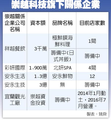 繼投資設立「安永鮮物」之後,看好觀光餐飲業後市,代理銷售半導體原料的上市公司崇越科技,決定成立「祥越餐飲公司」布局餐飲市場,並已創「極鮮饌」中餐廳品牌,選定北市吉林路開設門市,後續將把經營觸角向烘焙咖啡、日式餐飲延伸,並發展連鎖。