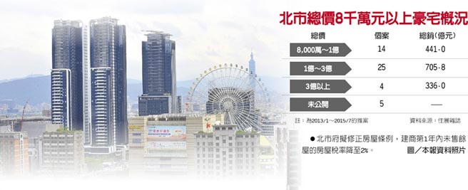 另外,對於公同共有房屋未設管理人者,房屋稅由3.6%降為2.4%。 台北市長柯文哲昨(9)日表示,北市府不鼓勵買預售屋,所以給建商這樣的空間,畢竟空屋應該視為一個待售的商品,而不是一個囤積的商品。一棟房子蓋好了拿出來賣,不能期待一下就賣掉,因此才允許讓建商有一年的時間做緩衝。修正後的稅率是給建商一點空間,並讓市場買預售屋的情況降低,至於緩衝期為1年,這當然還有討論空間。 住展雜誌企研室經理何世昌因此預期,104年7月1日之後取得使用執照且尚未全數完銷,或採先建後售的建商,都可望是柯P鬆綁新屋第1年未售餘屋房屋稅的最大受惠者。 根據住展雜誌最新出爐調查顯示,可望在104年7月1日之後完工並且取得使照的新案,台北市總計共有240筆、總戶數9,703戶、總銷約4,576億元,其中已售約3,422戶,平均銷售率約35%;之中每戶總價在8,000萬~3億以上的豪宅個案共有43筆、總銷約1,482.8億元,可望是柯P「開小門」之後的最大贏家。(工商時報)