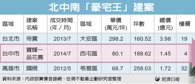 台中「豪宅王」易主。根據最新實價登錄網資訊,台中「寶輝一品花園」有二件交易案,分別以總價3.23億元、每坪成交價80.1萬元成交,單價、總價雙創新高,打敗「聯聚信義大廈」,也推升台中房價每坪站上8字頭。北部地區則仍由「帝寶」每坪298萬元居冠;高雄則是「國硯」每坪68.7萬元拿下寶座。 蟬聯台中七期最貴豪宅的「聯聚信義大廈」,在最新一次實價登錄網中,將台中「豪宅王」寶座讓給「寶輝一品花園」。依此次揭露的最新實價行情,「寶輝一品花園」位於四樓的住宅在去年7月交易,有188.62坪,扣除車位後,每坪成交單價衝上8字頭,刷新台中每坪單價新紀錄。