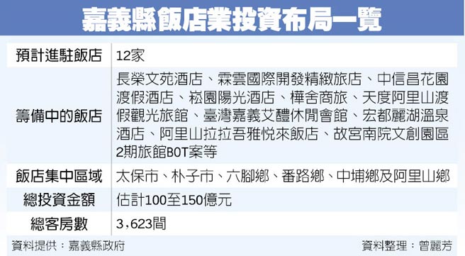 故宮南院將於年底試營運,預估每年可吸引百萬名遊客參觀,加上大阿里山風景區去年帶進逾340萬名國內外遊客,嘉義縣觀光產業充滿無限商機,目前已吸引12家觀光酒店與旅館爭相搶進嘉義縣投資卡位,帶進逾百億元的投資金額,預期將帶動嘉義縣觀光產業蓬勃發展。 嘉義縣文化觀光局長吳芳銘表示,目前籌設中的12家觀光酒店與旅館,預計在3至5年內陸續營運,預估可為嘉義縣新增3,623間客房,「嘉義縣目前應該是全台灣飯店業投資最旺、最密集的縣市」。 由於故宮南院位於嘉義縣太保市、朴子市、六腳鄉等3個鄉鎮之間,因此,新飯店大都集中在上述3個鄉鎮,如長榮文苑酒店、崧園陽光酒店、樺舍商旅等。 而布局大阿里山風景區的飯店業者,則集中於番路鄉、中埔鄉與阿里山鄉,如宏都麗湖溫泉酒店、天度阿里山渡假觀光旅館、中信昌花園渡假酒店、霖雲國際開發精緻旅店等等。 值得一提的是,位於阿里山國家風景區裡的百年老店「阿里山賓館」,早已斥資改建成為觀光級酒店。今年11月正逢「阿里山賓館」102週年慶,為歡慶週年,近期將推出超值特惠住房專案吸客,同時也將於飯店內展示百年鐵道車站、百花照、星空導覽、開放參觀蔣公套房等活動。 吳芳銘強調,新飯店爭相進軍嘉義縣投資卡位,不僅是看中故宮南院與大阿里山風景區的觀光商機,由於嘉義縣府積極推動「大埔美精密機械園區」與「馬稠後工業區」開發案,將各自分成2期開發,目前都在進行招商,包括上銀、和大與高鋒、程泰等工具機大廠都將陸續進駐設廠,預期兩大工業區完成開發後,可望創造4萬個就業機會,衍生的商務住房商機相當可觀。