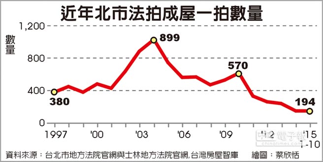 法拍市場一向被視為是觀察房市和景氣的重要指標,根據統計,北市成屋進入法拍市場第一拍數量,自2010年以來逐年遞減,去年196件為歷年最低,雖今年前10月中古屋一拍的件數已達194件,但因政府近幾年祭出調控房市政策,法拍數量仍維持低檔,預料今年法拍件數將維持近3年的200多件低檔水位,房市尚未有多殺多的疑慮。 台灣房屋智庫統計自1997年以來,北市成屋進入法拍市場第一拍的數量,其中,2003年SARS來襲房市景氣盪入谷底,當年北市成屋落入法拍第一拍數量達783件,隔年來到最高峰為899件。 2007年美國爆發次貸風暴,全球的經濟都受到大震盪,企業大量裁員,國內開始實施無薪假後,2010年法拍屋數量再次進入高峰,達570筆,是近10年最高。 2010年後,北市法拍數量開始逐年遞減,去年降至196件為歷年最低,今年前10月中古屋一拍的件數則為194件。 近一步分析歷年來北市各區域法拍屋數量,以中山區最多,累計有1,237件;第2名為大安區,累計有976件,近2年則以萬華區較多。
