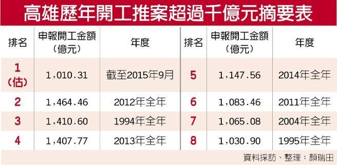 高雄歷年開工推案超過千億元摘要表
