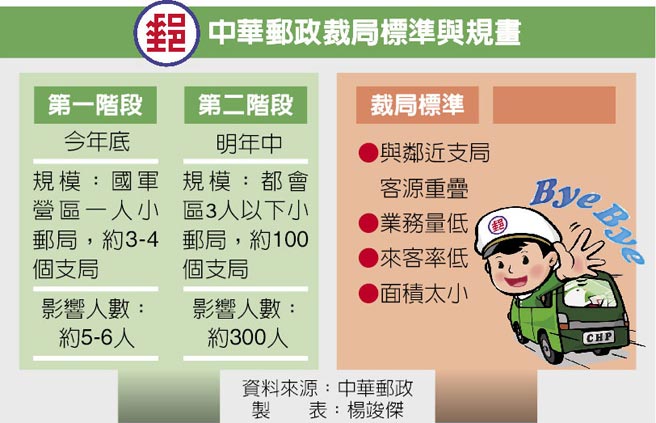 中華郵政在本月底大舉招考員工之際,悄悄啟動「整併計畫」,預計將裁撤近百間支局,最快今年底率先裁撤國軍營區內郵局,明年起陸續整併業務重疊、使用率低的支局,至少300名員工受影響。