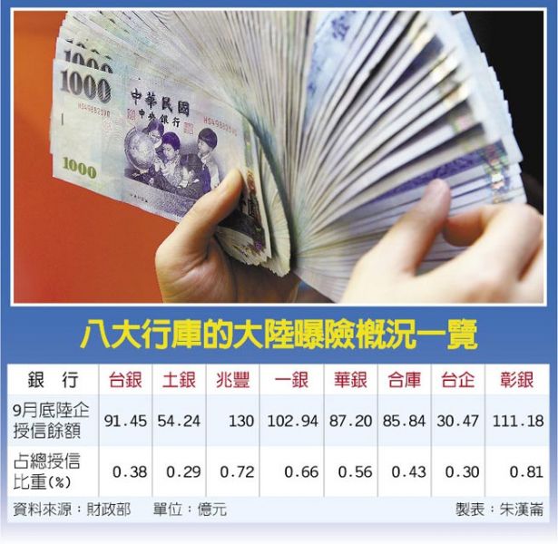 財政部上周完成對於行庫陸企曝險部位清查,並提交專案報告給立院財委會,根據這份最新統計,截至9月底八大行庫對中資企業授信餘額為693.32億元,其中純信貸款(指無擔放款)的比重占67.6%,達總量的三分之二。 財政部所定義的中資企業不包括台商,主要是央企及大陸民企,這些無擔授信,屬於中長期的有378.15億元、短期的有84.87億元,分別占總授信比重的54.5%與12.2%。 財政部在報告中特別說明,這是由於大陸聯貸市場多數沒有提供擔保品,至於中長期占大多數與聯貸期間多超過1年有關。