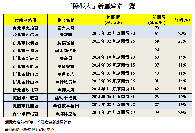 台北市方面,好房網指出,位北投奇岩重畫區內的「國美大奇」預售案,開出重砲降價的第一槍,開價70萬元,較原先區段內包括遠雄、華固、宏盛等上市建商先前建案開出85-95萬元一坪,直降20萬元,降幅超過二成。另位北市南港區研究院路的新成屋建案「謙閤」,2013年預售時開價80萬元一坪,現在新成屋開價64萬元一坪,房價跌幅也達二成。